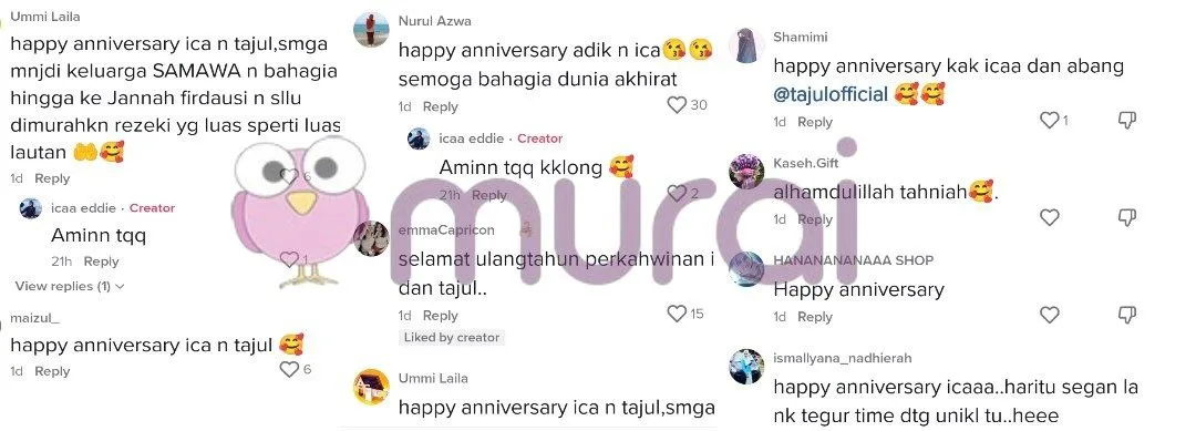 Menjengah keruangan komen posting tersebut, ramai peminat yang turut rasa gembira apabila melihat kebahagiaan mereka berdua dan mengucapkan selamat ulang tahun perkahwinan buat mereka. Peminat turut mendoakan kebahagiaan buat Tajul sekeluarga.