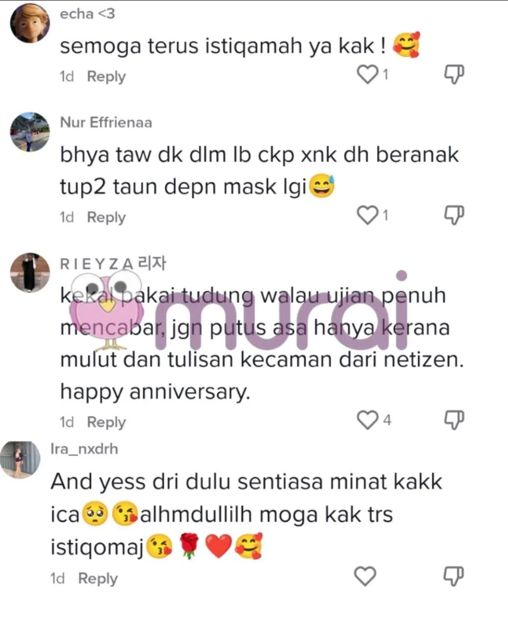 Ada juga yang turut mendoakan buat isterinya Ica untuk terus istiqomah  dan tidak putus asa dalam penghijrahannya walaupun pelbagai dugaan yang dihadapi olehnya.