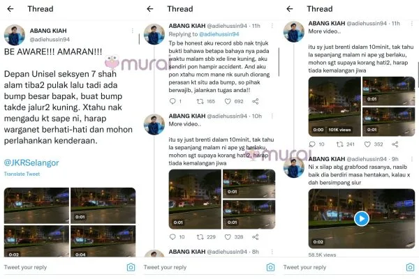 “Depan Unisel seksyen 7 Shah Alam tiba-tiba pula lalu tadi ada bump besar bapa, buat bump tak ada jalur-jalur kuning. Tak tahu nak mengadu dekat siapa ni. Harap warganet berhati-hati dan mohon perlahankan kenderaan.” Ciapnya