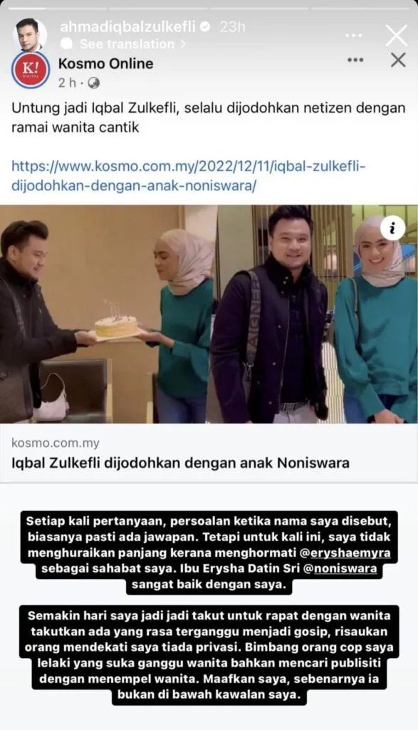 Menerusi kenyataan yang dikongsi menerusi Instagram Story, Iqbal mengatakan dia menghormati Erysha sebagai sahabat dan Noniswara sendiri yang disifatkan sangat baik dengannya.
