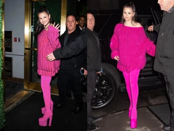 Menghadiri Saturday Night Live di New York City, Selena menyarung sweater off-the-shoulder dengan jalur labuci menegak daripada koleksi Valentino Pink PP. Dia menggandingkan sweater merah jambu dengan tights dan kasut tumit platform 7-inci Discobox, juga dari jenama yang sama.