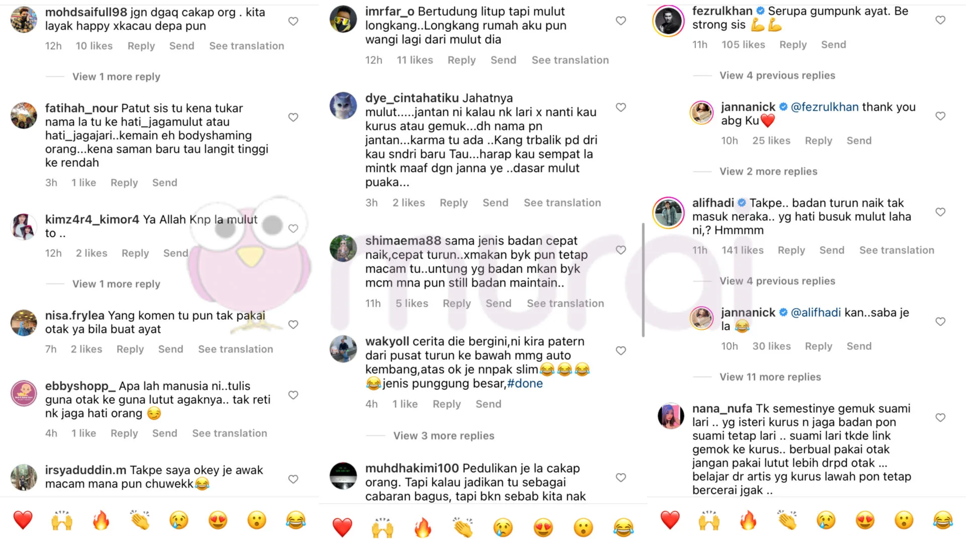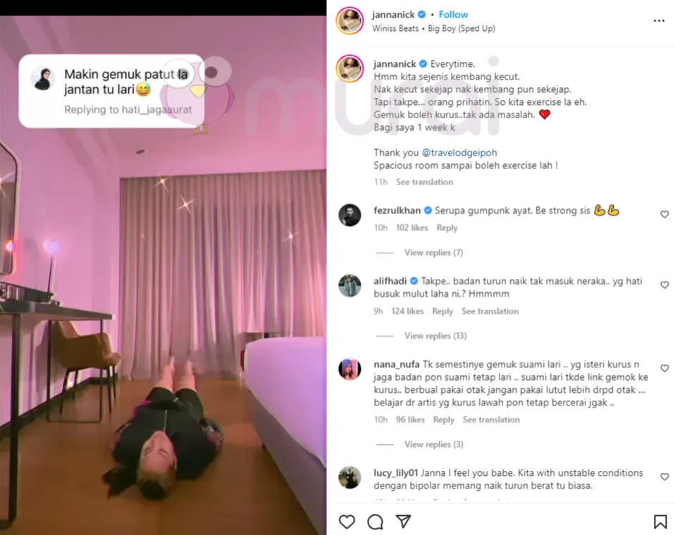Tapi takpe..Orang prihatin. So kita exercise la eh. Gemuk boleh kurus..Tak ada masalah ❤️. Bagi saya 1 week okay.”-Tulis Janna