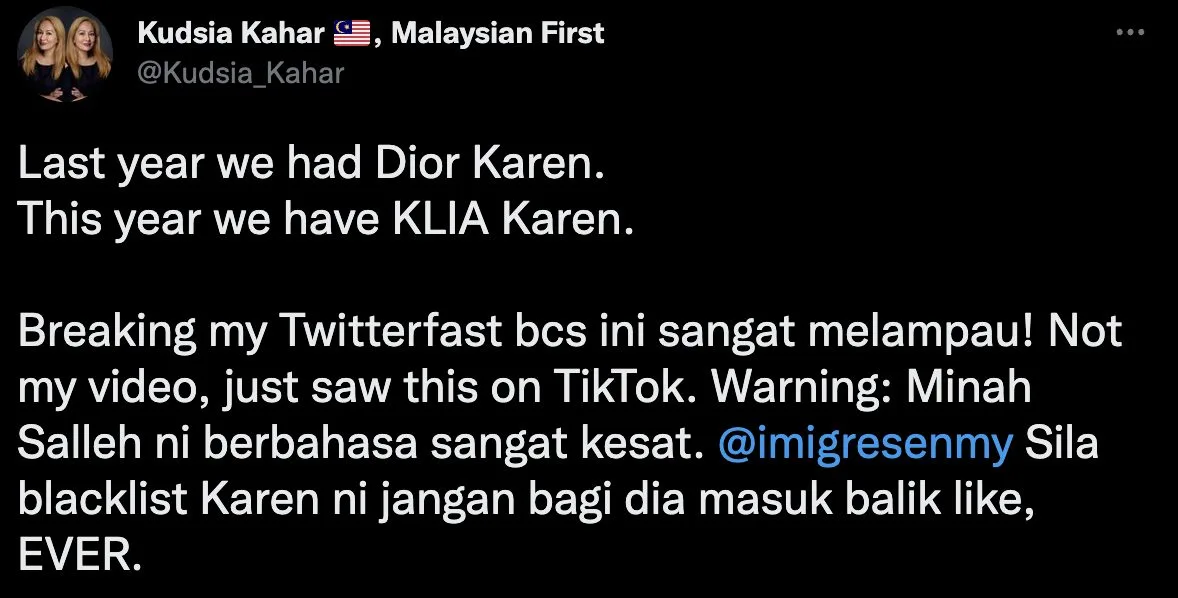“Tahun lepas kita ada Dior Karen. Tahun ini kita ada KLIA Karen. Breaking my Twitterfast sebab ini sangat melampau! Not my video, just saw this on TikTok. Warning: Minah Salleh ni berbahasa sangat kesat. @imigresenmy. Sila blacklist Karen ni jangan bagi dia masuk balik like, EVER.”