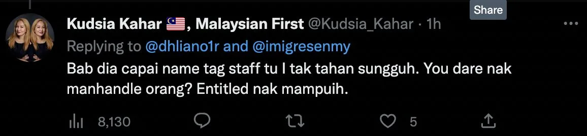 Kudsia di akaun Twitter peribadi telah menulis bahawa pihak Imigresen haruslah mengambil tindakan sewajarnya terhadap wanita tersebut. Katanya, individu seperti ini yang selalunya digelar sebagai ‘Karen’ seharusnya disenaraihitamkan untuk masuk ke Malaysia selepas ini.