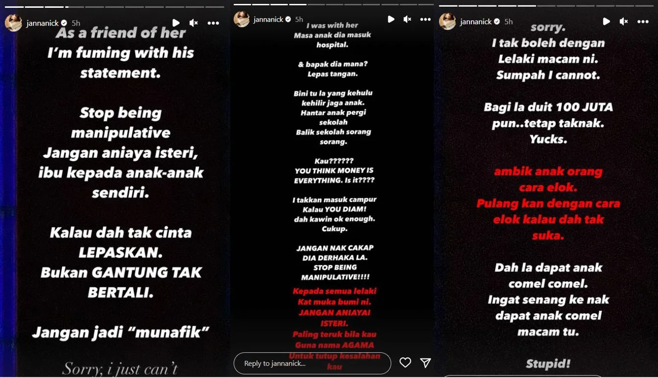 Walaupun tidak menyebut sebarang nama, Janna berkongsi rasa berang apabila menyifatkan lelaki berkenaan sebagai seorang suami yang telah menganiya isteri yang juga ibu kepada dua orang anak.