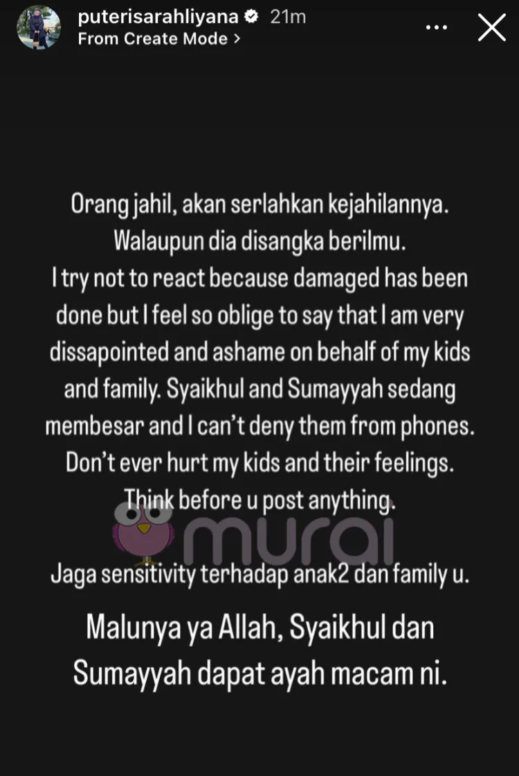 Jaga sensitiviti terhadap anak-anak dan family u. Malunya ya Allah, Syaikhul dan Sumayyah dapat anak-anak macam ni.”-Tulis Puteri Sarah