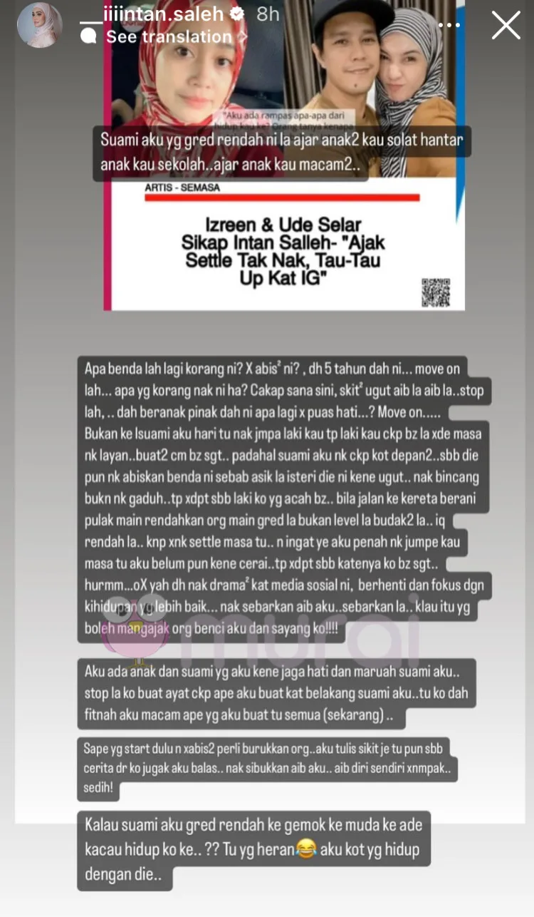 Terkini, Intan Saleh menerusi Insta Stories mempersoalkan tindakan Izreen dan Ude terhadap isu yang berlaku biarpun setelah lima tahun berlalu.