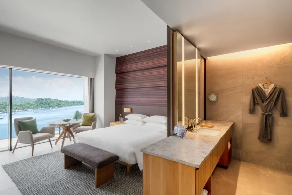 - Lobi hotel terbuka mewakili akar pokok dengan kehijauan padat yang mempamerkan pokok buluh dan ciri air yang menenangkan.