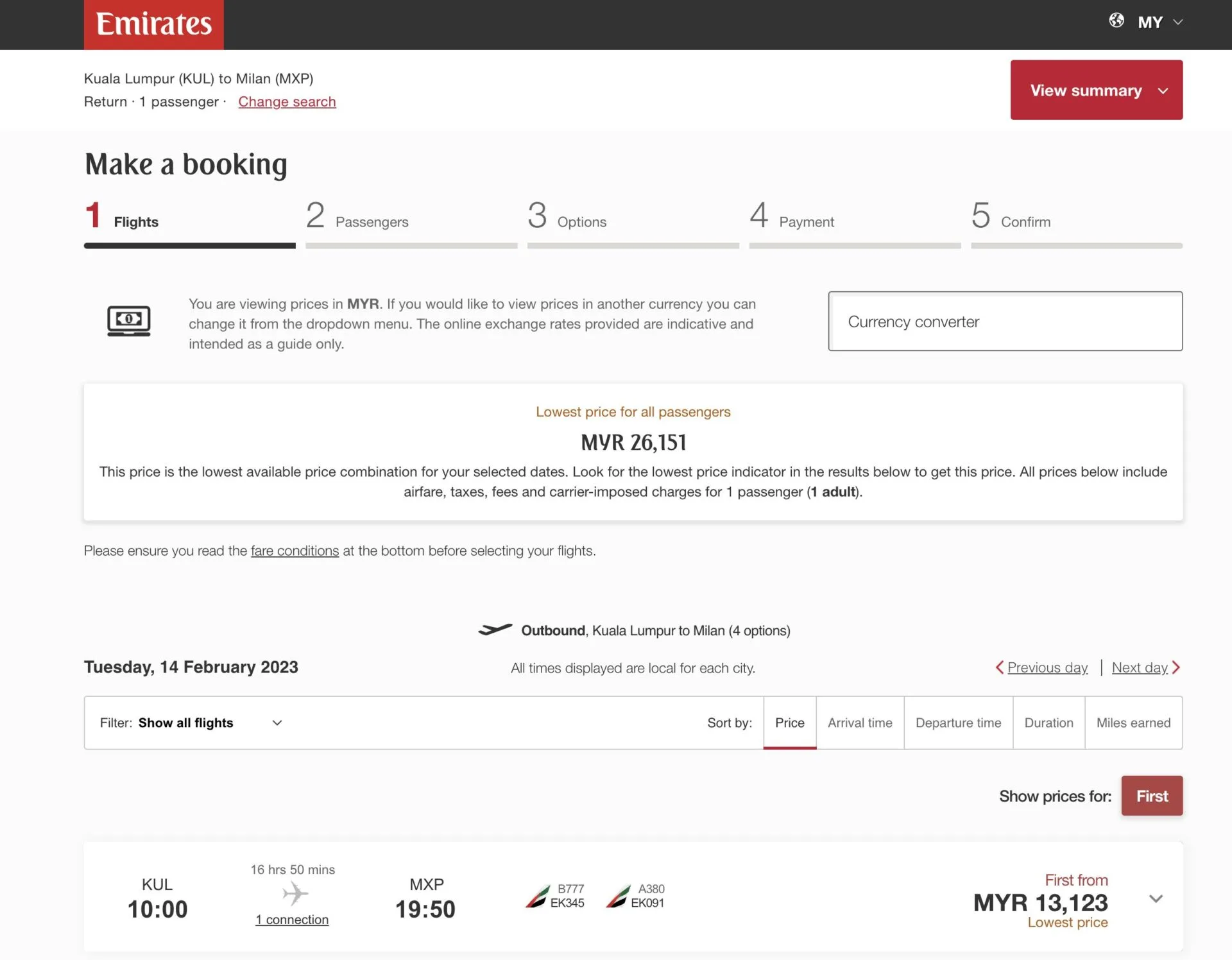 Menurut tinjauan kami laman sesawang Emirates, anggaran harga untuk pergi dan balik dari Kuala Lumpue ke Milan, Italy berjumlah RM26 ribu. Boleh beli sebuah kereta dengan harga ni!