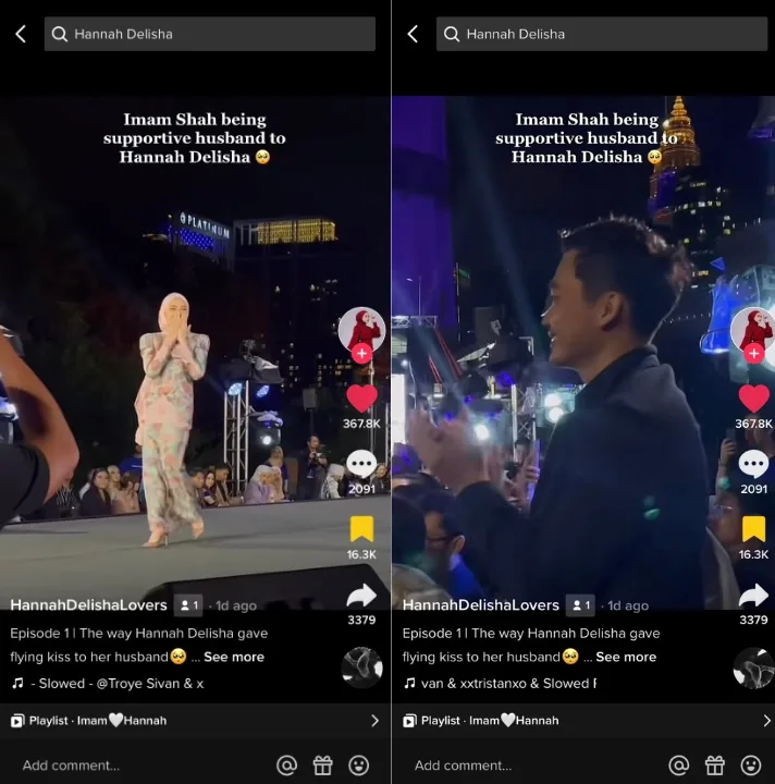 Baru-baru ini, menerusi tiktok akaun peminat Hannah Delisha, video tersebut mendapat 3.3 juta jumlah tontonan, 366 ribu tanda suka dan 2 ribu komen. Mereka berkongsikan video mengenai Hannah menjadi model di salah satu event Fashion Show. Di mana di dalam video tersebut, terlihat sang suami bangun dan memberi tepukan kepada Hannah, itu merupakan sebagai tanda beliau menyokong bakat isterinya itu.