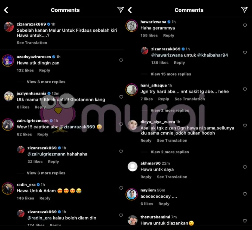 Kepsyen yang ditulis oleh Zizan itu telah menarik minat rakan-rakan artis serta netizen untuk meninggalkan komen pada gambar di instagram miliknya itu.