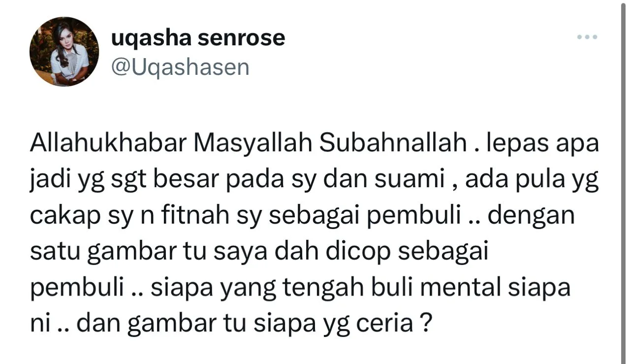 “Allahuakbar, Masya-Allah, Subhanallah. Selepas apa yang terjadi pada saya dan suami, ada pula yang fitnah saya sebagai pembuli… Dengan satu gambar itu saya dah di cop sebagai pembuli. Siapa yang tengah buli mental siapa? Dan gambar itu siapa yang ceria? -keluh Uqasha