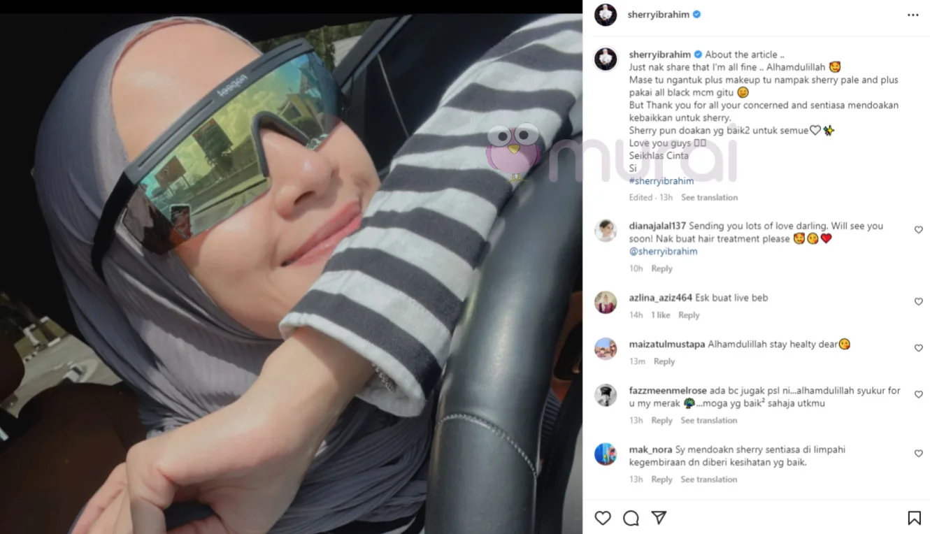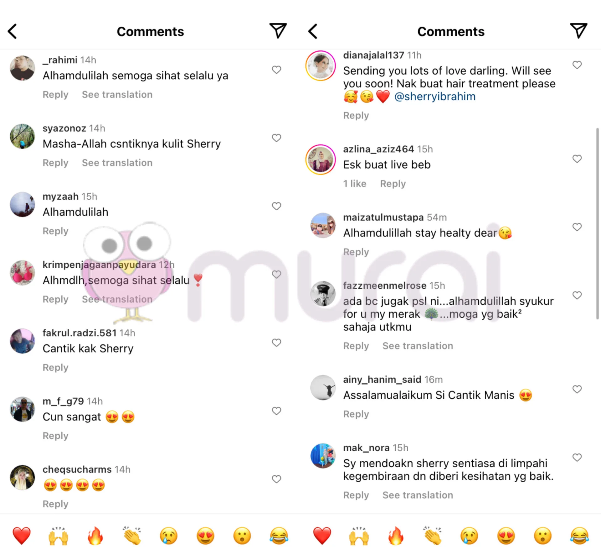 Ruangan komen hantaran Sherry turut dibanjiri dengan komen peminat yang meluahkan rasa syukur, malah ramai mendoakan agar Sherry diberikan kesihatan yang baik.