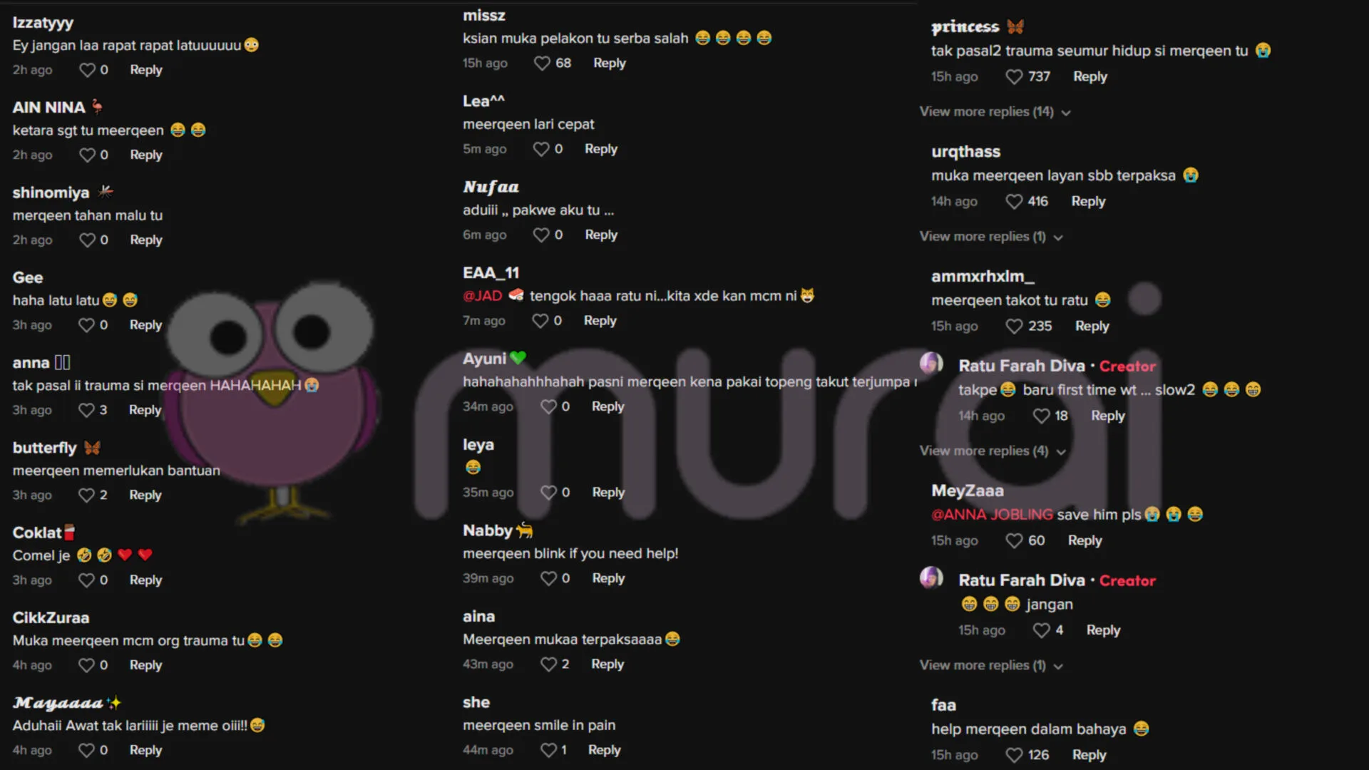 Video yang dimuatnaik oleh Ratu Farah telah dibanjiri dengan komen netizen yang berseloroh melihat Meerqeen berada dalam ‘keadaan bahaya’ kerana melayan konten personaliti TikTok sensasi berkenaan.