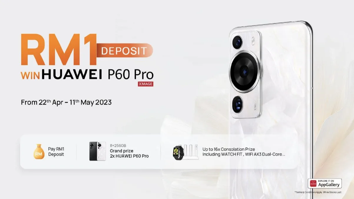 Bukan itu sahaja, Huawei baru-baru ini memperkenalkan kempen pra-pesanan eksklusif RM1 khusus untuk HUAWEI P60 Pro, di mana pelanggan hanya perlu meletakkan deposit RM1 dan menjawab ringkas soalan di Laman Web Rasmi HUAWEI untuk berpeluang memenangi hadiah misteri termasuk HUAWEI