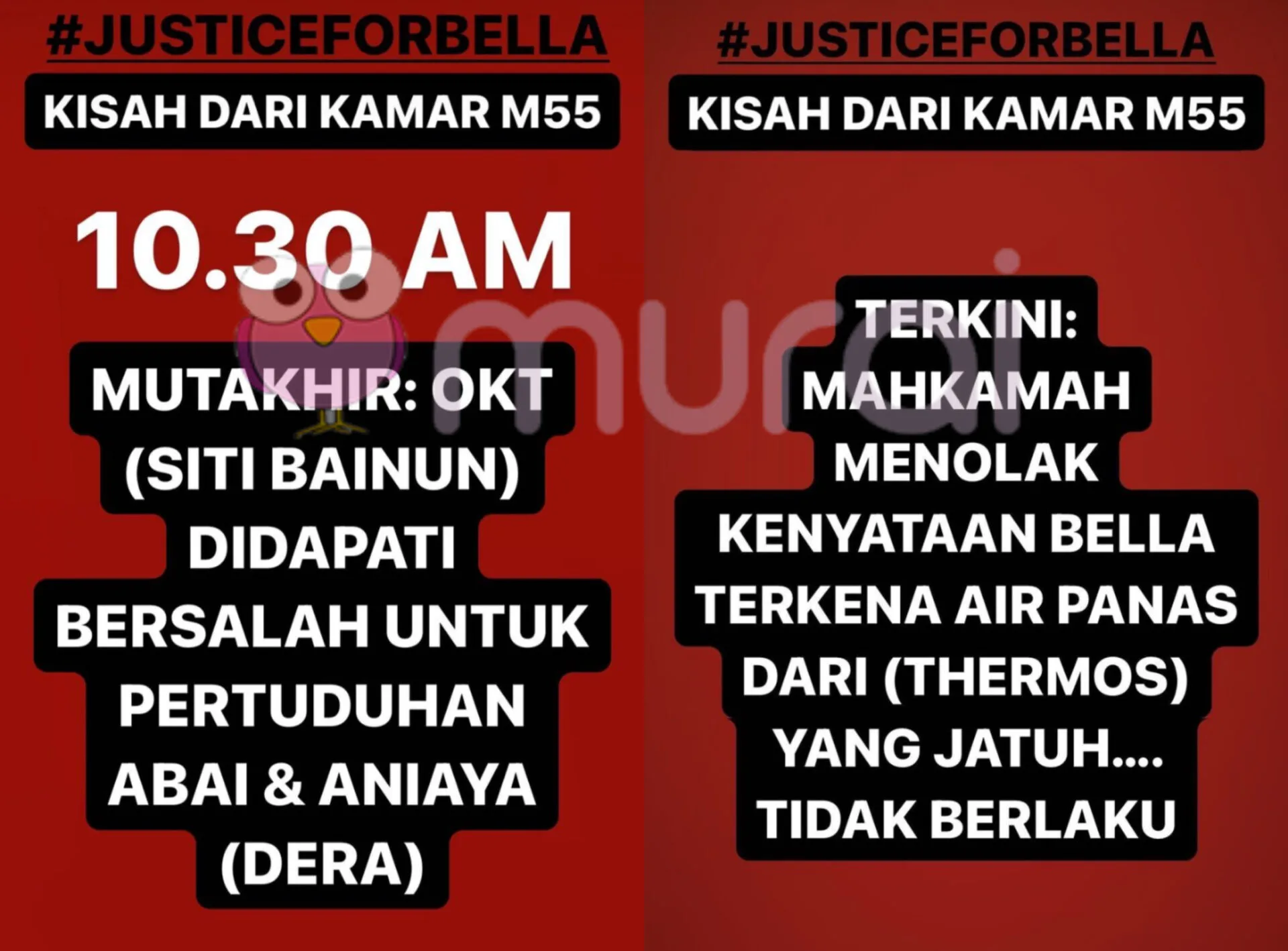 Akhirnya, keputusan mahkmah berpihak kepada Bella apabila Siti Bainun didapati bersalah oleh Mahkamah Sesyen atas dua pertuduhan mengabai dan menganiaya Bella.