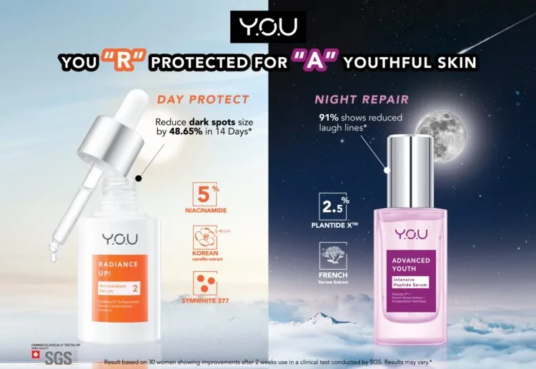 Rahsia untuk kulit sihat, berseri dan tegang itu sebenarnya bermula dengan rutin penjagaan kulit menggunakan Y.O.U Beauty di waktu siang iaitu Day R Protect dengan Radiance Up! Antioxidant Serum dan Night A Repair dengan Advanced Youth Intensive Peptide Serum di waktu malam.