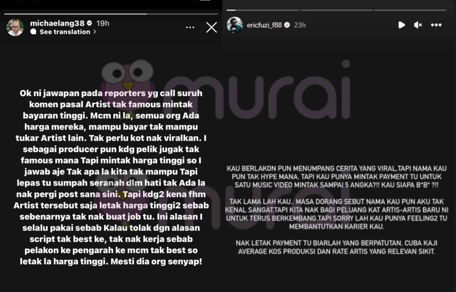 “Ok ni jawapan pada reporters yang call suruh komen pasal artist tak famous mintak bayaran tinggi. Macam ni la, semua orang ada harga mereka. kalau mampu, bayar, kalau tak mampu tukar artis lain. Tak perlu kot nak viralkan. I sebagai Producer pun kadang pelik jugak tak famous mana tapi mintak harga tinggi so i jawab aja t5ak apa la kita tak mampu tapi lepastu sumpah seranah dalam hati tak ada la nak pergi post sana sini”-kata Michael Ang
