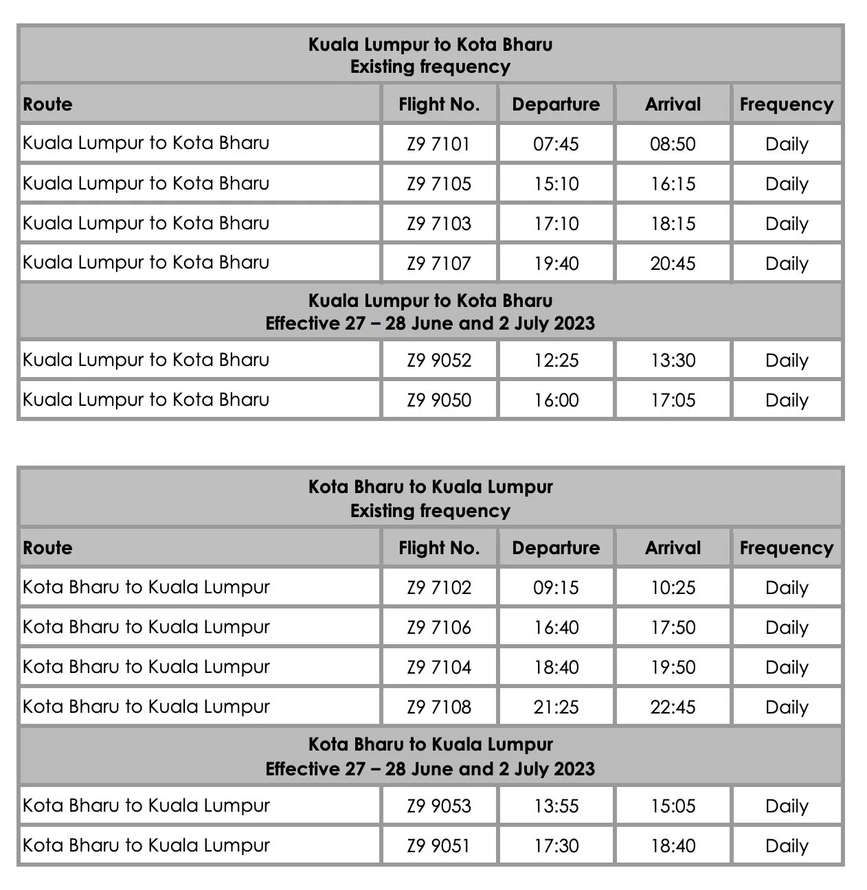 Jadual di bawah menunjukkan kekerapan tambahan dari Kuala Lumpur ke Kota Bharu yang disediakan oleh MYAirline