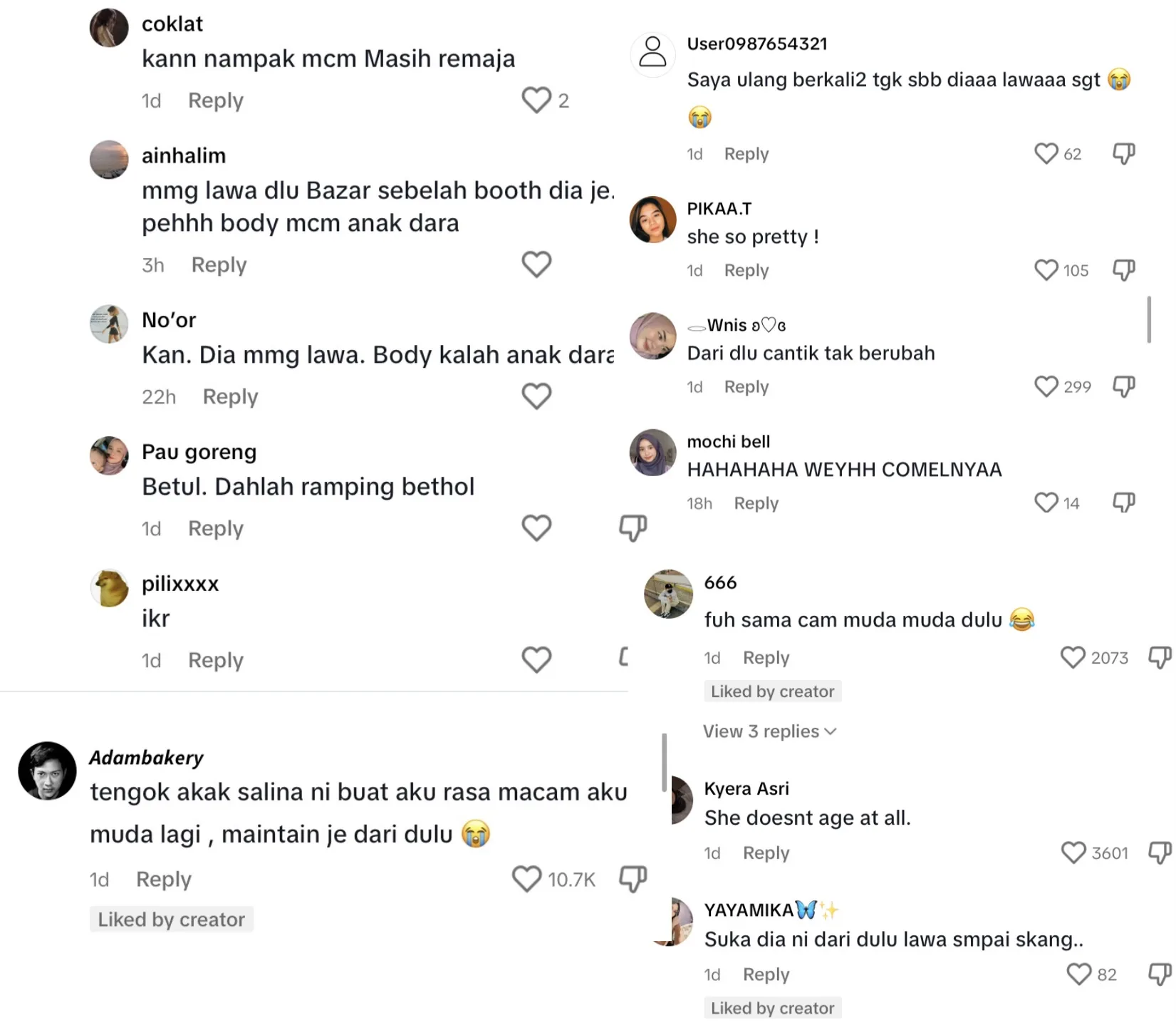 “Kann nampak macam masih remaja. Tengok akak Salina ni buat aku rasa macam muda lagi, maintain je dari dulu”-kata mereka
