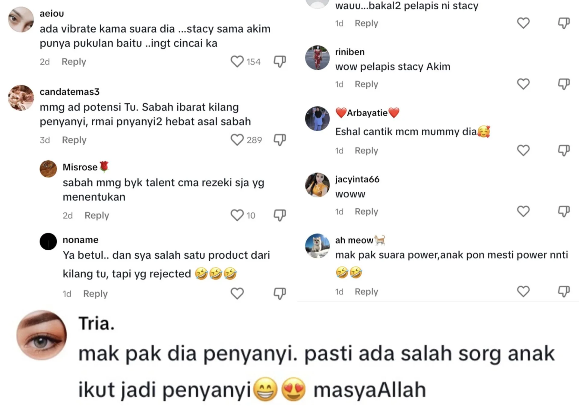 Rata-rata peinati yang komen pada video berkenaan mereka teruja akan nyanyian daripada Eshaal itu. Ada juga yang mengatakan bahawa kemungkinan Eshaal menjadi pewaris dan pengganti Satcy dan Akim.