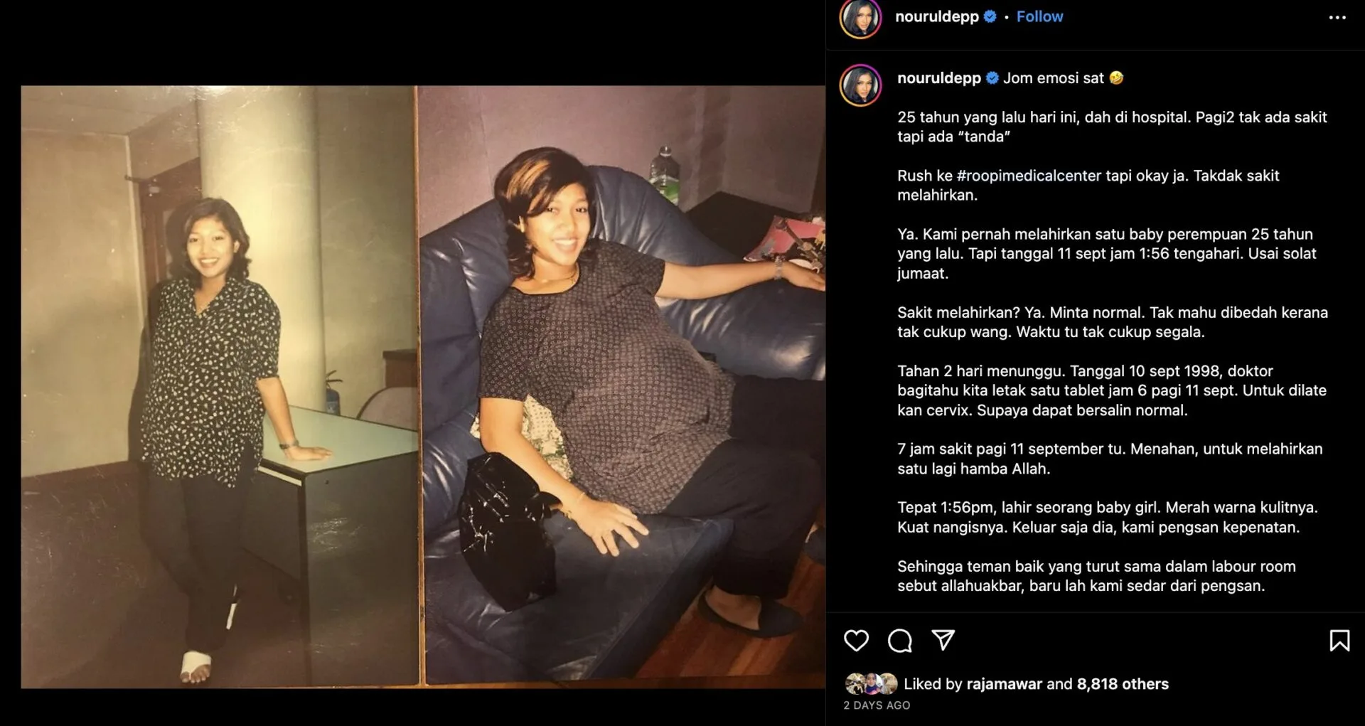Beberapa hari yang lalu, hantaran dibuat penyanyi Nourul Depp, 46, di Instagram mencetuskan tanda tanya peminat. Nourul berkongsi pengalaman melahirkan anak sulung, Ayu Nazirah, kira-kira 25 tahun lalu dan meluahkan isi hatinya.
