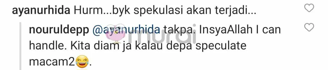 Dalam pada itu, di ruangan komen, peminat menegur Nourul atau nama sebenarnya, Noorulhuda Abdul Wahab, bimbang jika banyak spekulasi akan muncul dengan perkongsian ini.
