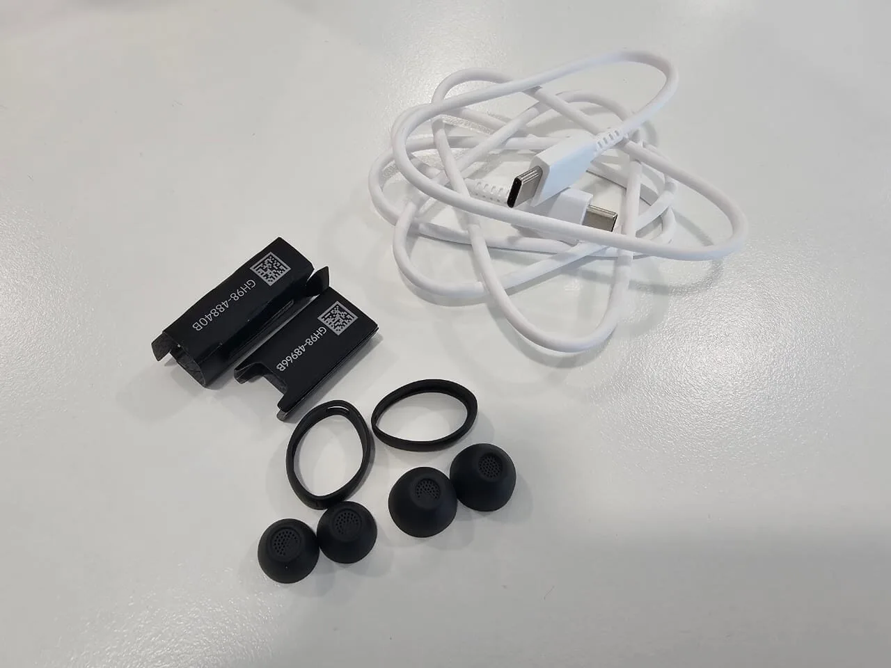 Selain daripada yang telah dipasang, dalam pakej jualan anda akan menemui set tambahan hujung sayap dan dua set tambahan hujung telinga, serta manual pengguna dan jaminan, serta kabel USB Type-C.