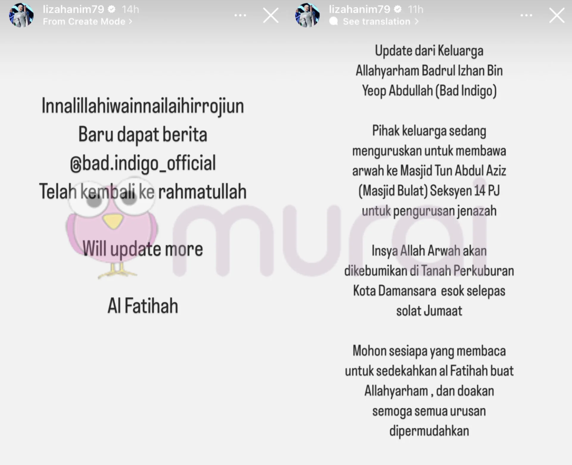“Baru dapat berita @bad.indigo_official telah kembali ke rahmatullah. Al-Fatihah.”-tulis Liza Hanim