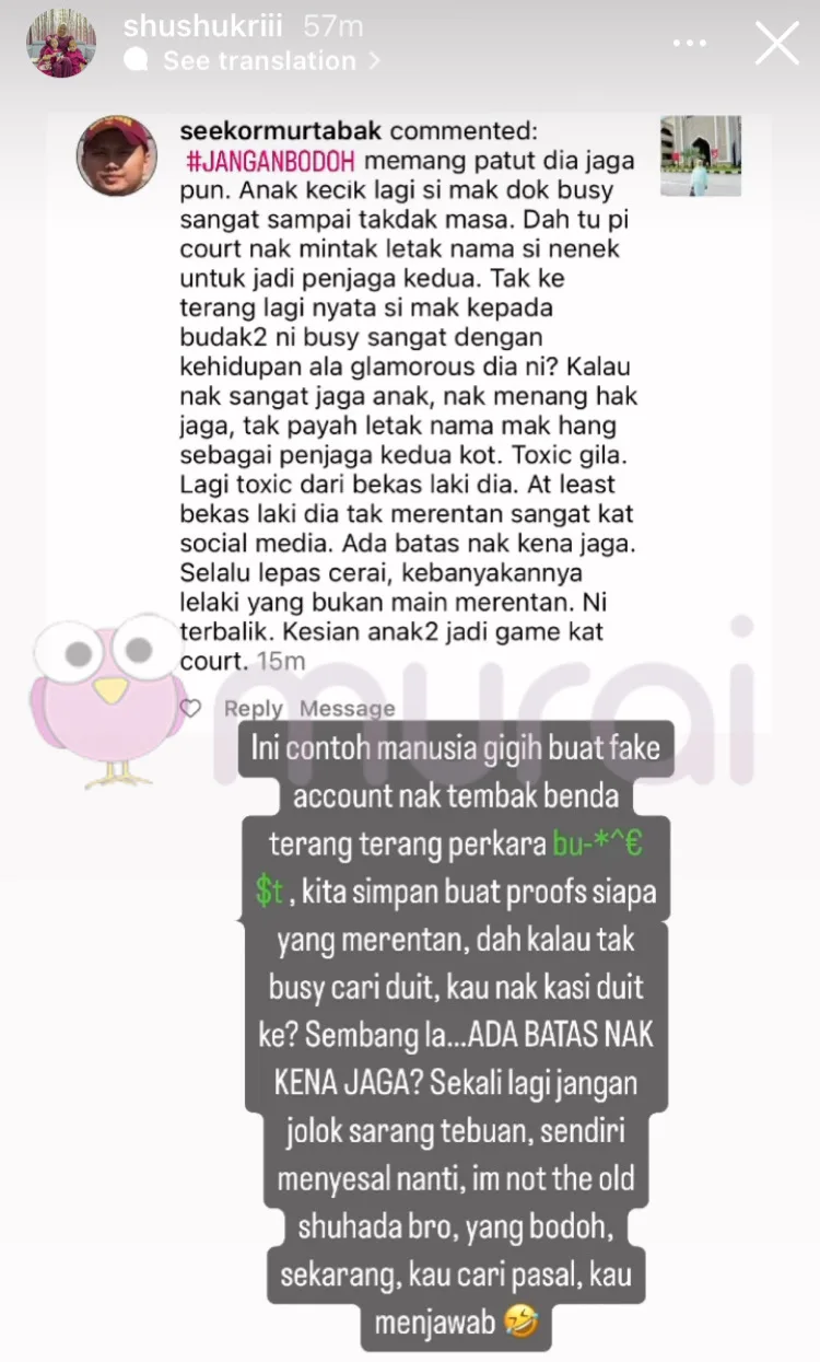 Kalau nak sangat jaga anak, nak menang hak jaga, tak payah letak nama mak hang sebagai penjaga kedua kot. Toksik gila. Lagi toksik dari bekas laki dia. At least bekas laki dia tak merentan sangat kat social media.”-komen seorang netizen di Instagram