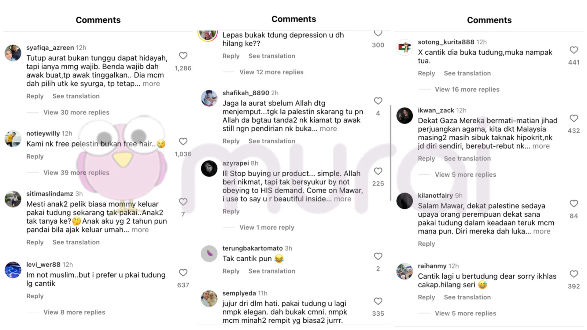 “Tutup aurat bukan tunggu dapat hidayah, tapi ianya mmg wajib. Benda wajib dah awak buat,tapi awak tinggalkan.. Dia mcm dah pilih utk ke syurga, tapi tetap nak ke neraka.. hmmm sorry kak mawar.. We all love you.. saya unfollow dulu, nanti dah berhijab saya follow semula ok.. kami nak fokus pasai saudara kita kat palestin dlu…”