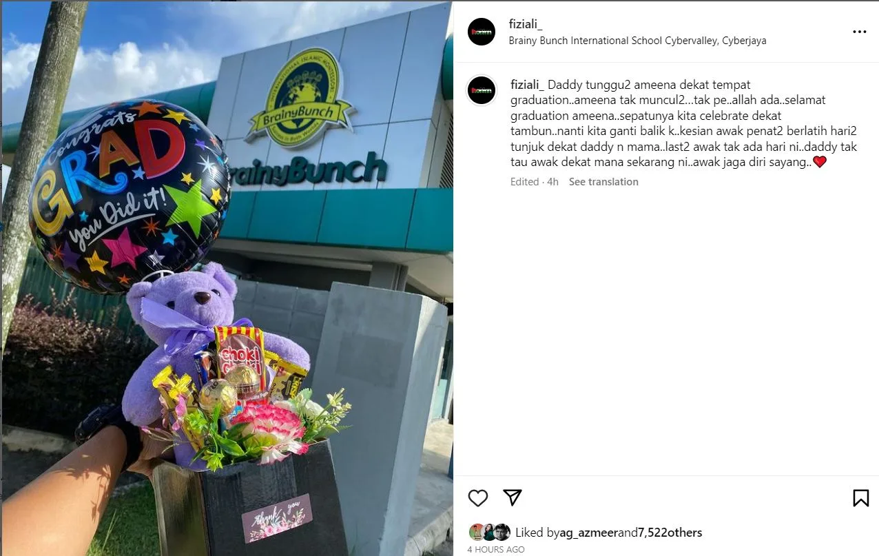 Terbaru, Fizi turut berkongsikan kepada umum mengenai perasaan terujanya bertukar menjadi sedih apabila niat untuk berjumpa anaknya semasa majlis graduasi di sebuah tadika tidak kesampaian.
