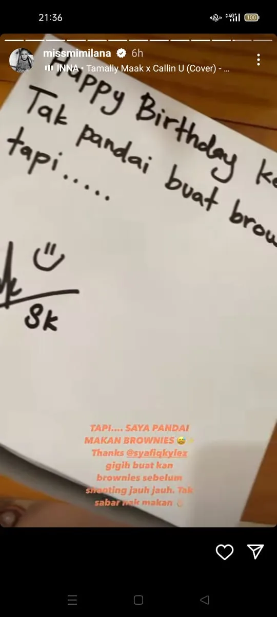 “Happy birthday yang ke-28. Tak pandai buat brownies tapi…,” tulisnya ringkas namun sarat makna mendalam.