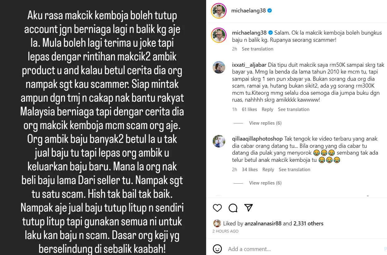 Malah Michael Ang turut menyelar tindakan Makcik Kemboja tersebut dan meminta supaya dia boleh bungkus pakaian dan balik ke kampung asalnya.