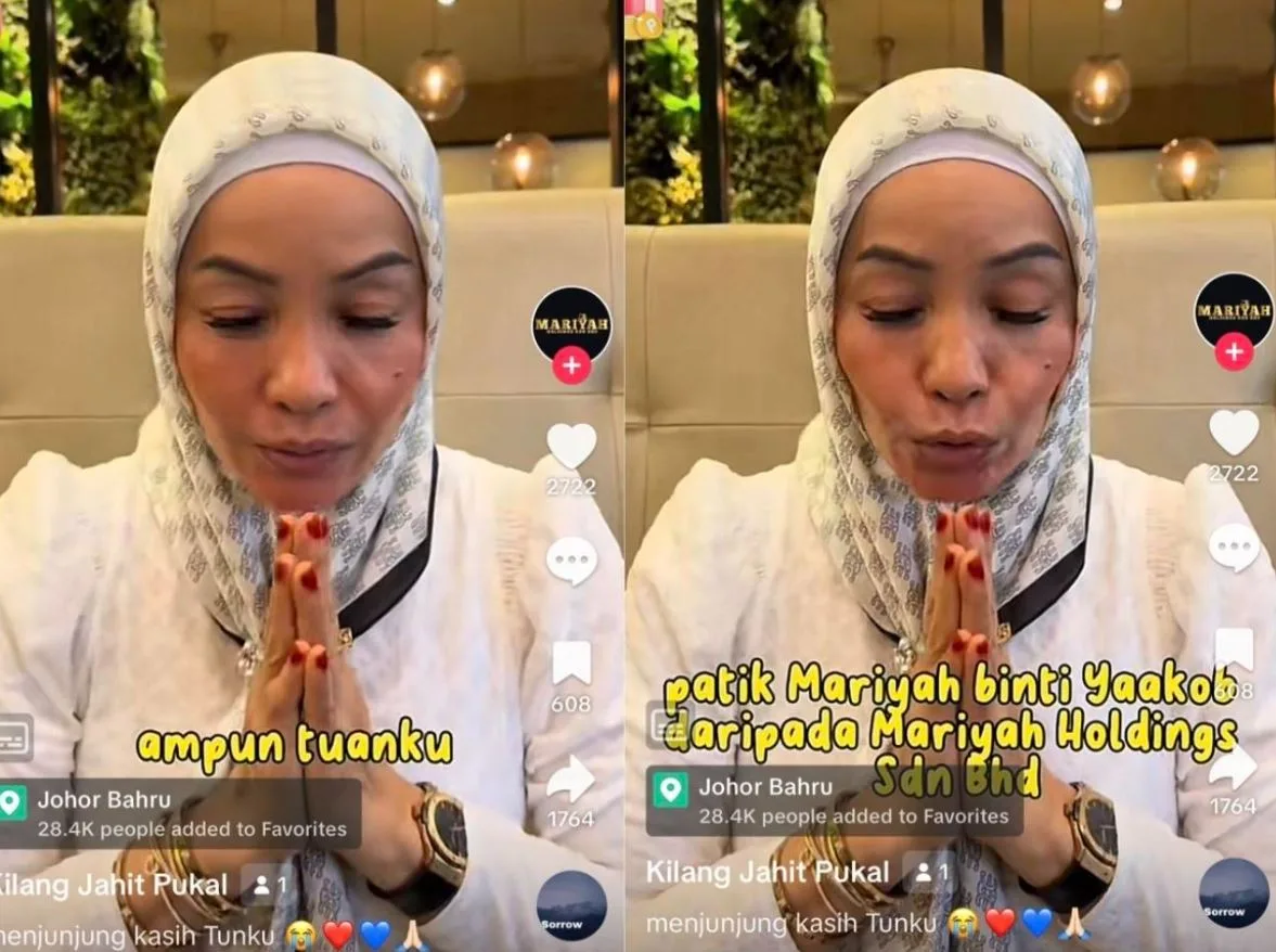 Susulan itu, Mariyah yang merupakan pemilik sebuah gedung tekstil yang menjalankan perniagaan jahitan pukal di Skudai, Johor tampil membuat permohonan maaf secara terbuka selepas videonya itu tersebar luas.