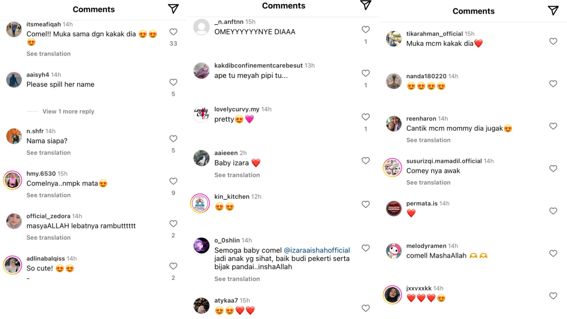 Di ruangan komen, rata-rata netizen meluahkan rasa teruja melihat wajah comel anak kedua Izara biarpun hanya dari pandangan sisi sahaja, malah ada yang turut berpendapat wajah bayi kedua ini mirip seperti kakaknya, Irisa Alaia.