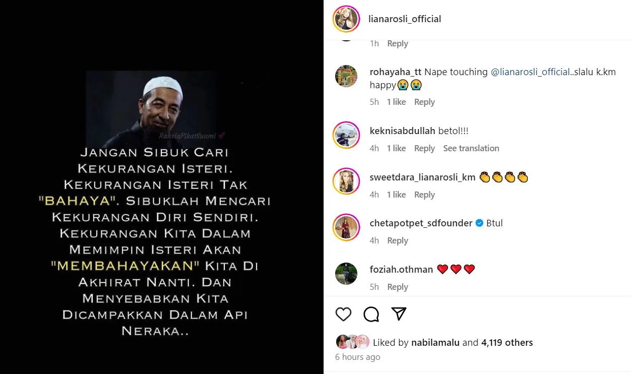 Dalam hantaran tersebut, Kak KM memuat naik sekeping gambar berlatarbelakangkan wajah Ustaz Azhar Indrus dan petikan ayat yang berkaitan dengan seorang suami.