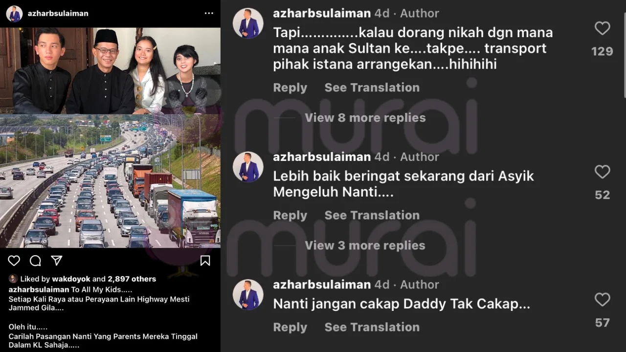 “Tapi, kalau diorang nikah dengan mana-mana anak sultan ke, takpe. Sebab transport pihak istana arrangekan. hihihi”-tambah Azhar Sulaiman