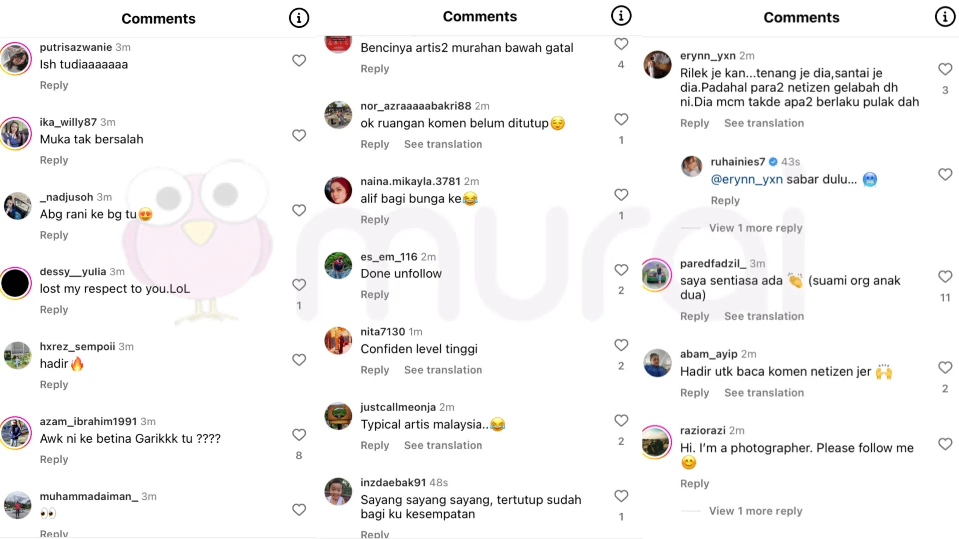 Rata-rata netizen dilihat menyindir pelakon ini berhubung isu dirinya ditangkap berkhalwat, sebelum Ruhainies bertindak menutup ruangan komen berkenaan.