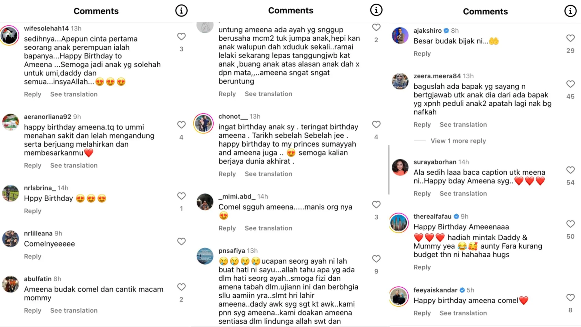 “Alaa sedih laa baca caption untuk meena ni. Happy birthday Ameena sayang ❤❤❤.”- Suraya Borhan