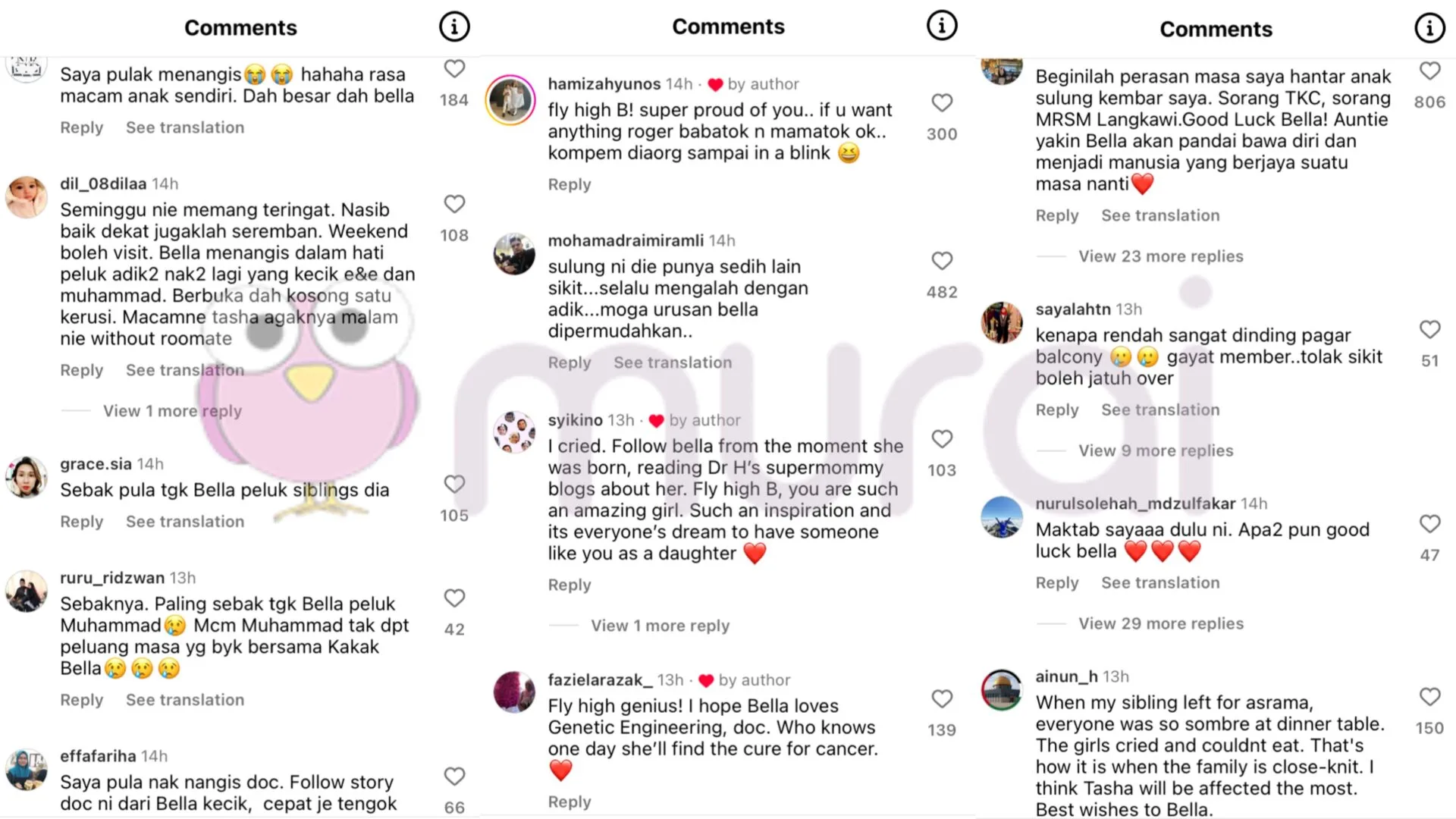Menjengah ke ruangan komen, rata-rata netizen meluahkan rasa sebak melihat Bella terpaksa berpisah dengan adik-beradiknya yang lain, malah ramai yang turut berkongsi pengalaman mereka menghantar anak ke asrama.