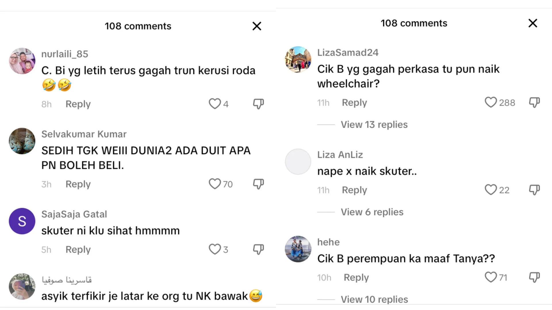 Menjengah ke ruangan komen, perkongsian DSV itu mendapat pelbagai reaksi netizen, malah ada yang turut mempersoalkan fizikal Cik B yang sihat namun masih menggunakan kerusi roda.