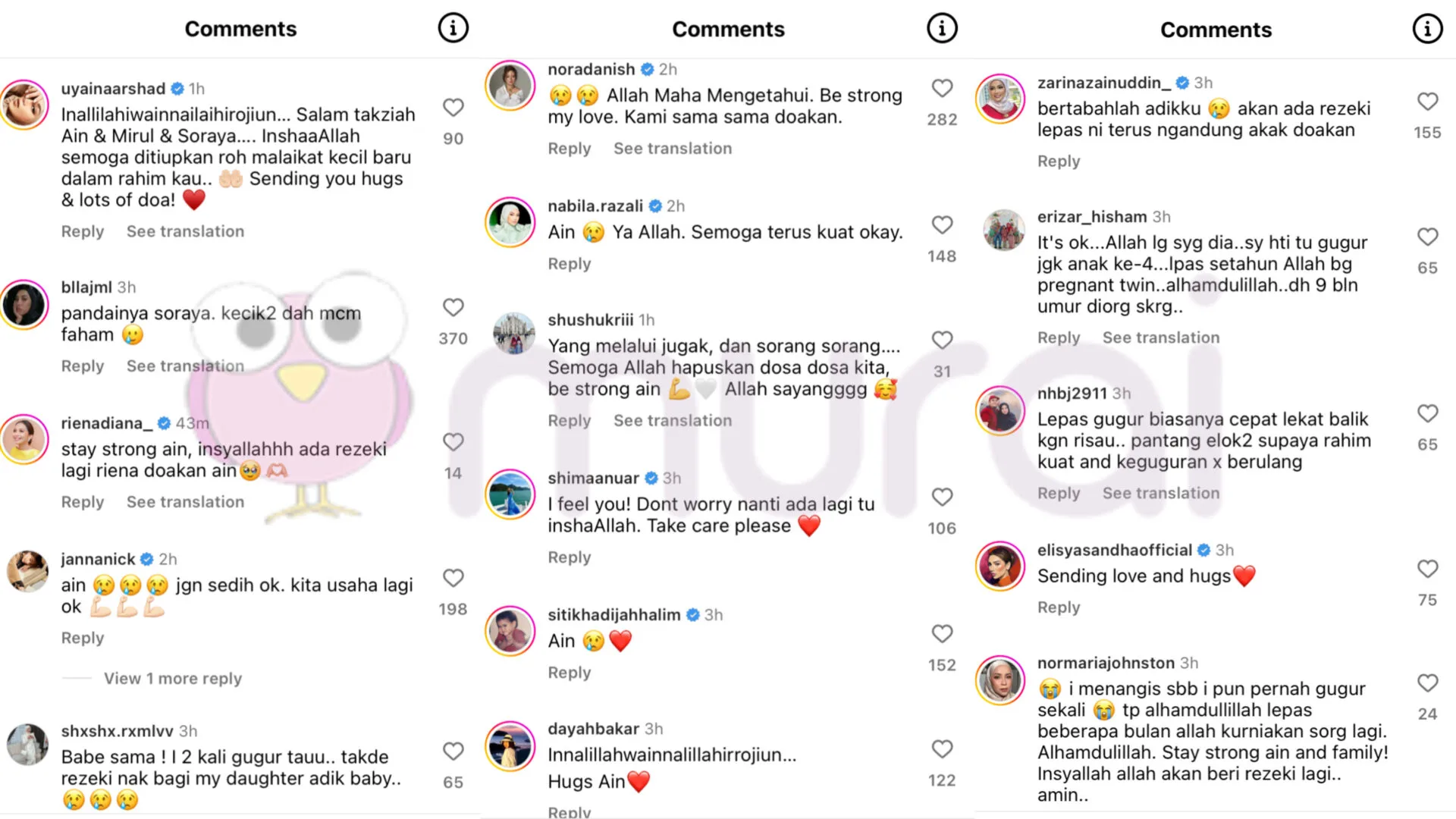 “Inallilahiwainnailaihirojiun… Salam takziah Ain & Mirul & Soraya…. InshaaAllah semoga ditiupkan roh malaikat kecil baru dalam rahim kau.. ?? Sending you hugs & lots of doa! ♥️-“Uyaina Arshad