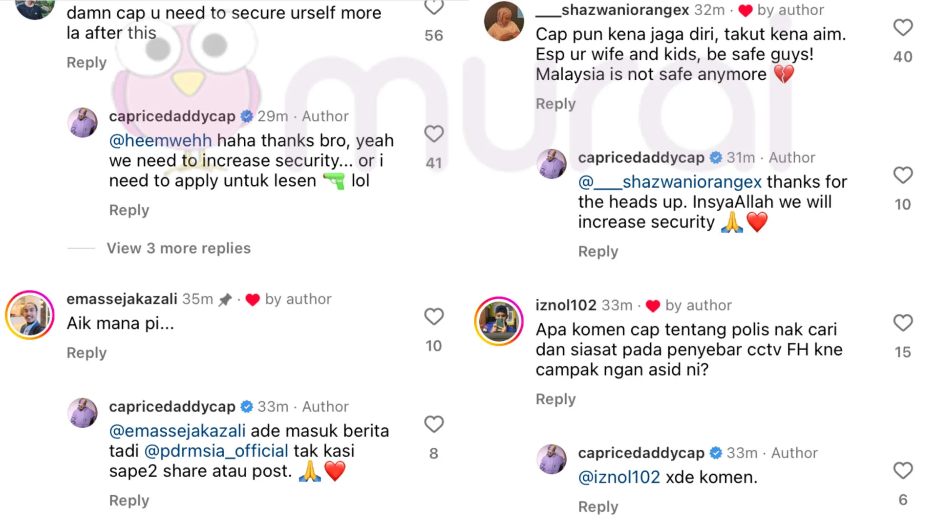 Hantaran Caprice di Instagram, mendapat respon netizen di ruangan komen yang rata-ratanya meminta penyanyi rap ini menjaga aspek keselamatan keluarganya, malah ada yang mencadangkan Caprice untuk memohon pemilikan lesen senjata api.