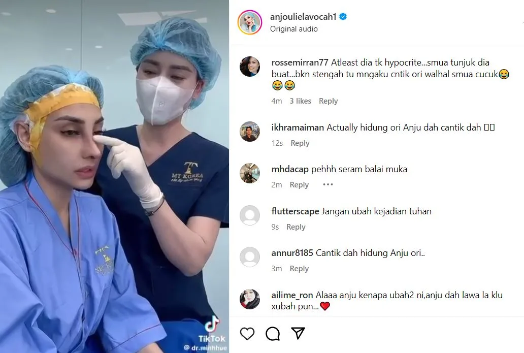 Dalam video yang dimuat naik dalam Instagram miliknya, Anju menunjukkan kepada umum pembedahan hidung yang semakin mancung dan proses menanggalkan dan membersihkan bahagian mukanya selepas beberapa hari pembedahan.