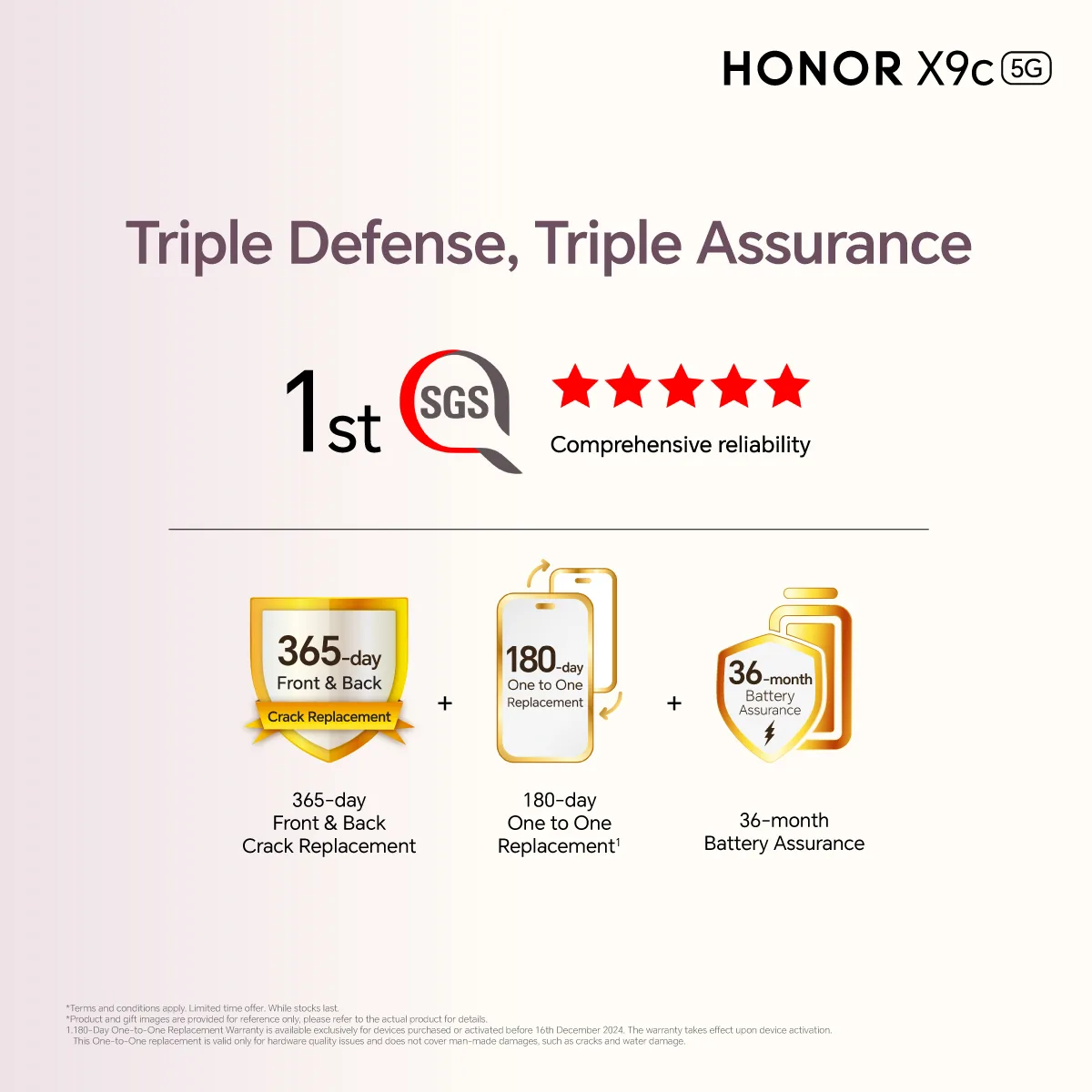 HONOR X9c 5G menawarkan pakej Jaminan Tiga Tahap yang termasuk penggantian retak, jaminan bateri, dan polisi penggantian satu sama satu. Pakej ini memberikan pengguna keyakinan dan ketenangan fikiran dalam menggunakan peranti, memastikan perlindungan menyeluruh selama tiga tahun.