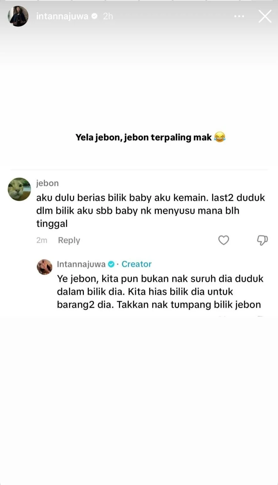 Intan kemudian dilihat membidas komen netizen berkenaan dengan menjelaskan bahawa dia hanya menghias bilik cahaya matanya itu untuk menyimpan barang-barang milik bayinya kelak.