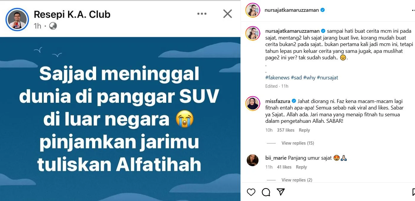 Dalam hantaran tersebut, Sajat telah berkongsikan tangkap layar daripada halaman di Facebook yang mana kononnya Sajat telah meninggal di luar negara.