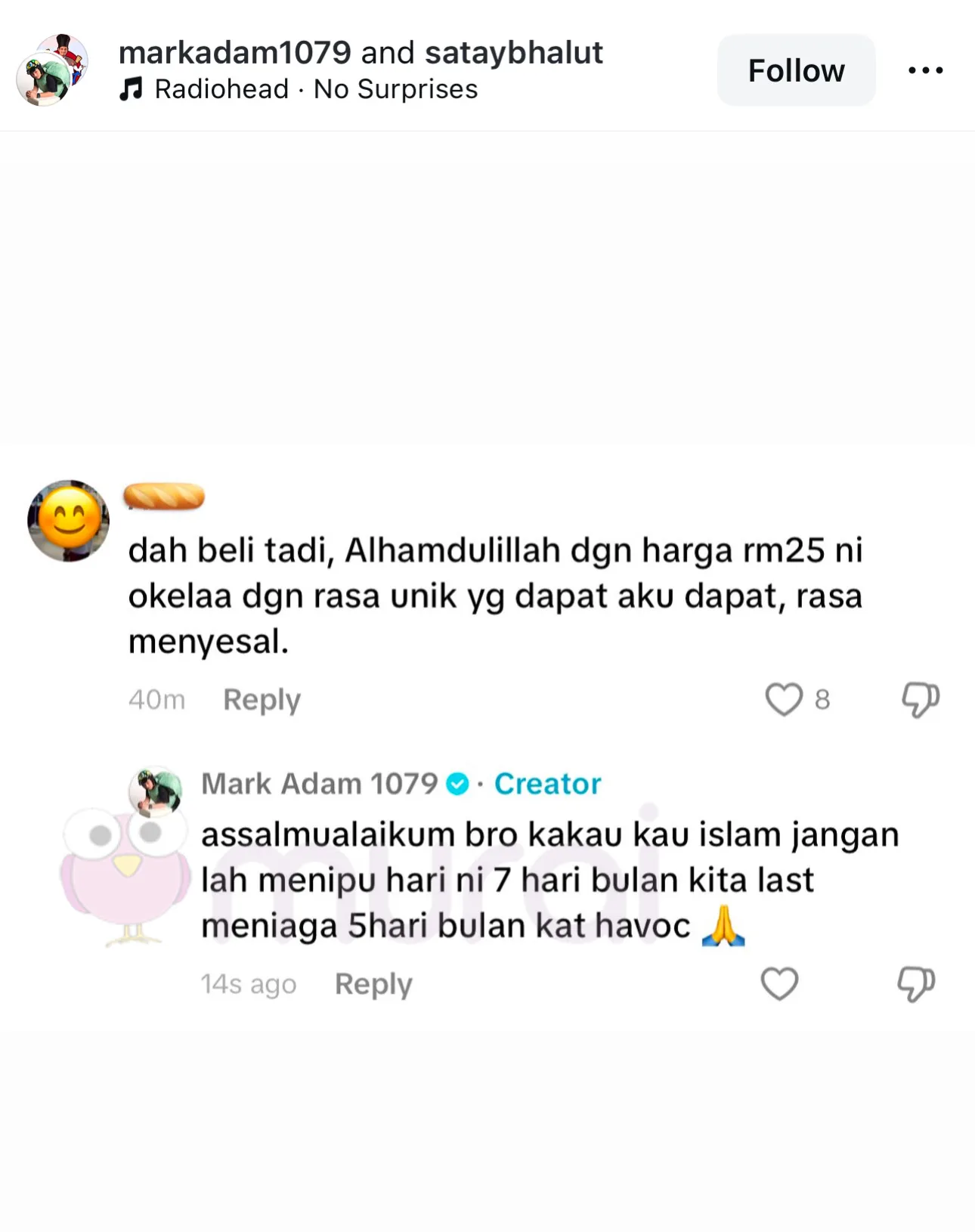 “Dah beli tadi, Alhamdulillah dengan harga RM25.00 ni okay la dengan rasa unik yang aku dapat, rasa menyesal.”-komen seorang netizen di TikTok