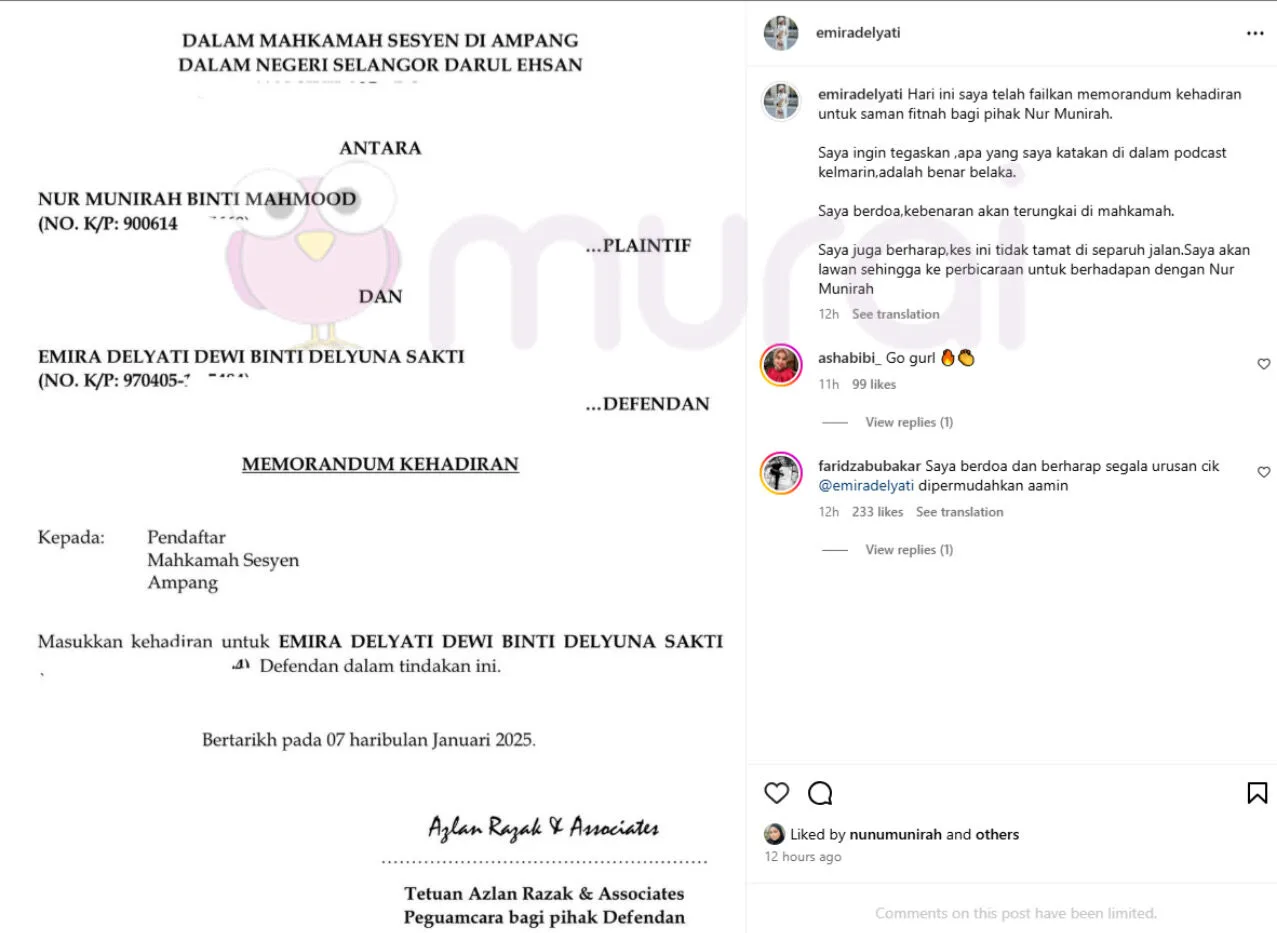 “Hari ini saya telah failkan memorandum kehadiran untuk saman fitnah bagi pihak Nur Munirah.